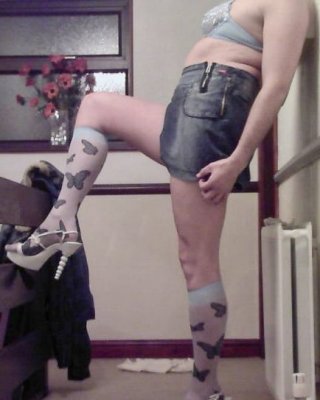 キュートなベイビー、ロキシー・ロックスがデニムのスカートとヒールで完全に服を着てポーズをとる